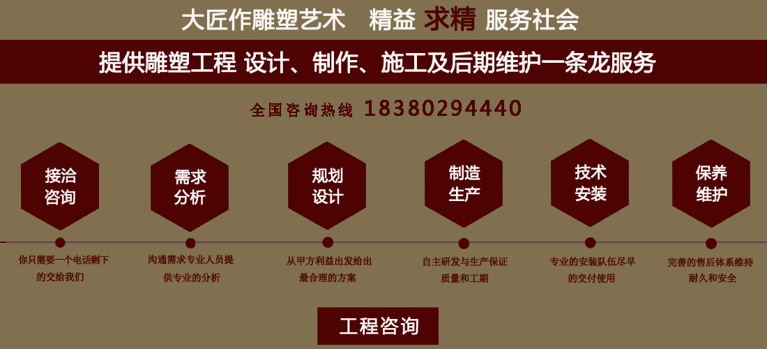 成都大匠作雕塑有限公司,是經成都工商局審定注冊的正規(guī)專業(yè)雕塑制作及工程安裝服務機構,是由一群年輕富有朝氣的年輕人創(chuàng)辦,發(fā)軔于四川省成都市龍泉驛區。它是一家******于創(chuàng)作、制作和銷售為一體的公司。大匠作擁有多年從事公共藝術的專業(yè)人員和雕塑制作人組成的核心團隊,為您提供專業(yè)、具創(chuàng)新的設計及制作服務。公司成立以來,秉承“******服務、誠信為本”的宗旨,以客戶需求為目標導向,不斷學習,進取,優(yōu)化和提高服務質量,公司向您******——“您的滿意***是我們的信譽”,我們將以飽滿的熱情和******的服務贏得您的贊譽和支持。